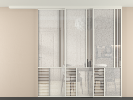 Во всех алюминиевых перегородках, независимо от типа установки, используется компланарный раздвижной механизм, благодаря которому декоративная крышка и полотно находятся в одной плоскости.
