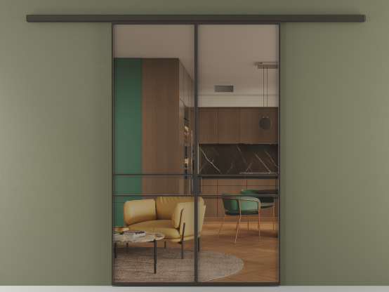 Во всех алюминиевых перегородках, независимо от типа установки, используется компланарный раздвижной механизм, благодаря которому декоративная крышка и полотно находятся в одной плоскости.