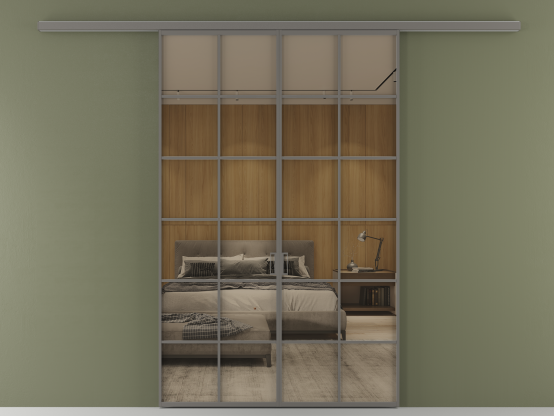 Во всех алюминиевых перегородках, независимо от типа установки, используется компланарный раздвижной механизм, благодаря которому декоративная крышка и полотно находятся в одной плоскости.