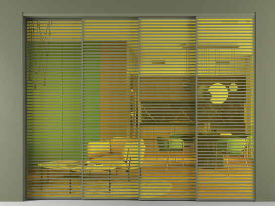 Во всех алюминиевых перегородках, независимо от типа установки, используется компланарный раздвижной механизм, благодаря которому декоративная крышка и полотно находятся в одной плоскости.