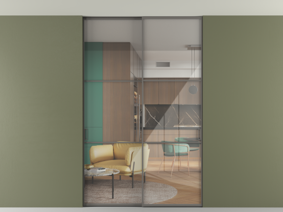 Во всех алюминиевых перегородках, независимо от типа установки, используется компланарный раздвижной механизм, благодаря которому декоративная крышка и полотно находятся в одной плоскости.
