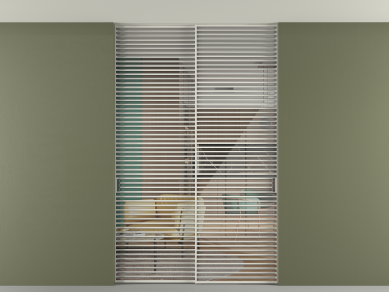 Во всех алюминиевых перегородках, независимо от типа установки, используется компланарный раздвижной механизм, благодаря которому декоративная крышка и полотно находятся в одной плоскости.