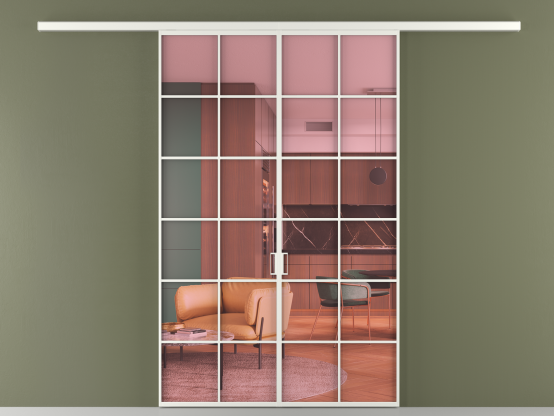 Во всех алюминиевых перегородках, независимо от типа установки, используется компланарный раздвижной механизм, благодаря которому декоративная крышка и полотно находятся в одной плоскости.