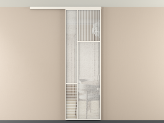 Во всех алюминиевых перегородках, независимо от типа установки, используется компланарный раздвижной механизм, благодаря которому декоративная крышка и полотно находятся в одной плоскости.