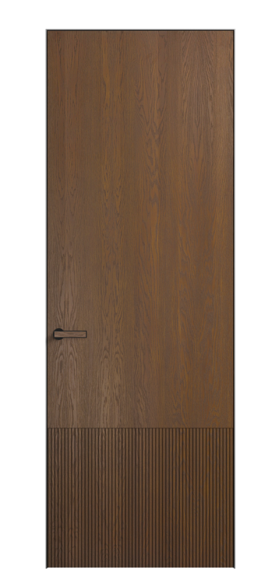 Это полотна с рельефной фрезеровкой. Этот прием делает интерьер объемным, тактильным, вносит интересную текстуру и создает современный образ. Волнистый рельеф может быть выполнен по ламелям из массива дуба в древесных матовых отделках, либо исполнен по натуральному и экологически безопасному материалу — ХДФ, покрытому гладкой эмалью актуальных оттенков.
