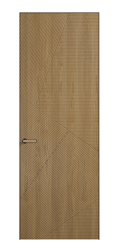 Это полотна с рельефной фрезеровкой. Этот прием делает интерьер объемным, тактильным, вносит интересную текстуру и создает современный образ. Волнистый рельеф может быть выполнен по ламелям из массива дуба в древесных матовых отделках, либо исполнен по натуральному и экологически безопасному материалу — ХДФ, покрытому гладкой эмалью актуальных оттенков.